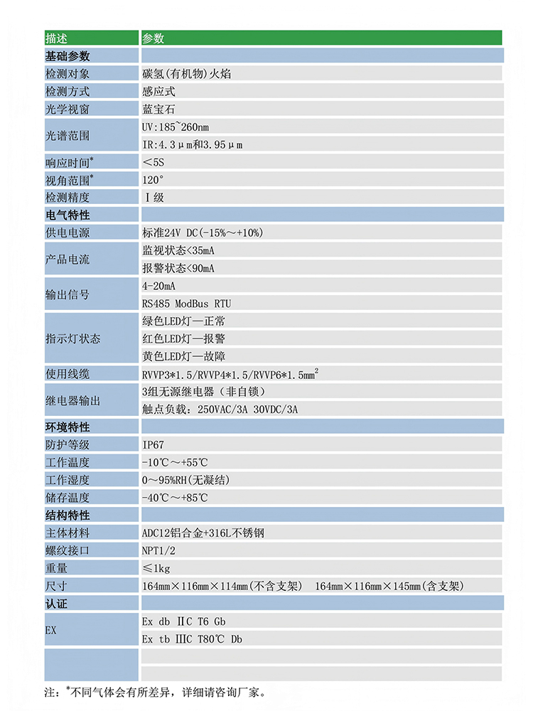 | 名稱:火焰探測器 檢測原理:感光式 光譜范圍:UV:185~260nm/IR1:4.3μm/IR2:3.95μm 玻璃材質(zhì):藍寶石 | 防爆等級:Ex db ⅡC T6 Gb/Ex tb ⅢC T80℃ Db 防護等級:IP67 響應(yīng)時間:<5s 工作溫度:-10℃~+55℃ |